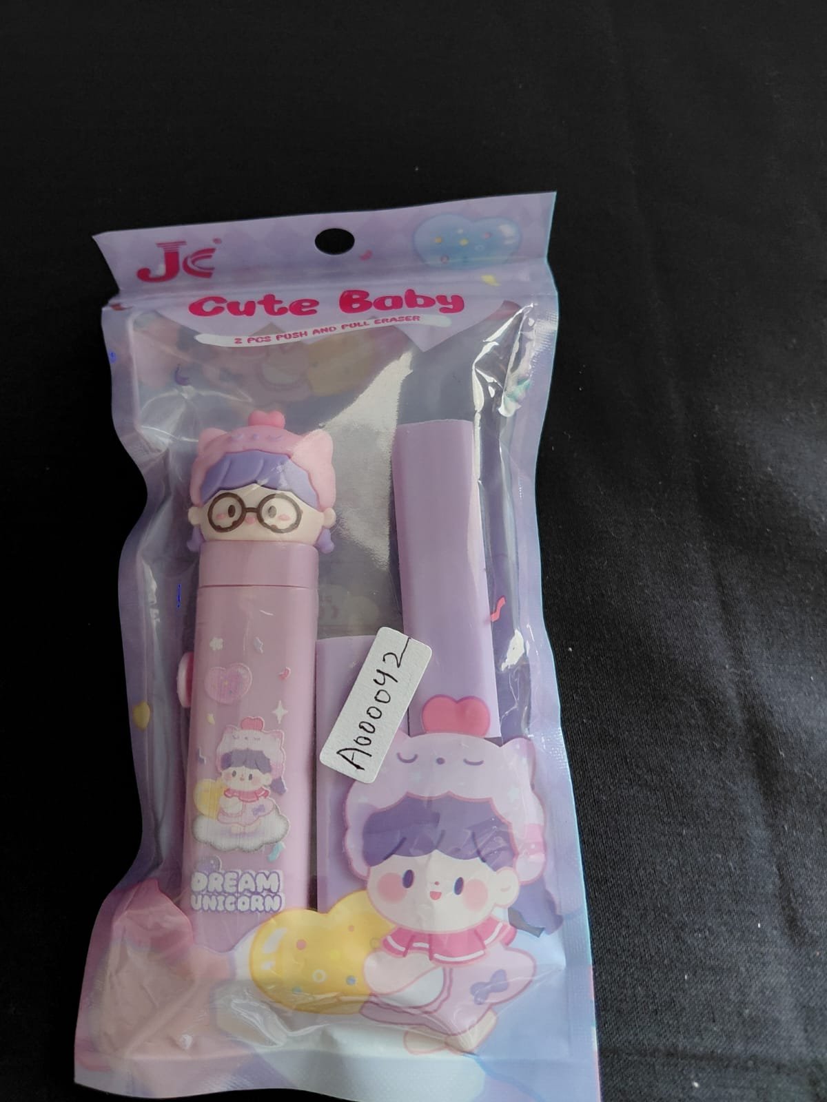 Introducing the JCC-630 Push and Pull Eraser Set?a delightful duo of innovative erasers designed for effortless use and superior performance. Each set includes two uniquely crafted erasers, perfectly sized for comfortable grip and precision erasing. Presented in an eye-catching purple package adorned with an adorable character illustration, this set not only stands out on any desk but also brings a touch of fun to your daily routine. Clear usage instructions are conveniently printed on the back, making these erasers ideal for students, artists, or professionals seeking reliable stationery essentials. Add charm and functionality to your collection or gift the set to someone special. Package size: 8 cm x 4 cm. Eraser color: white.