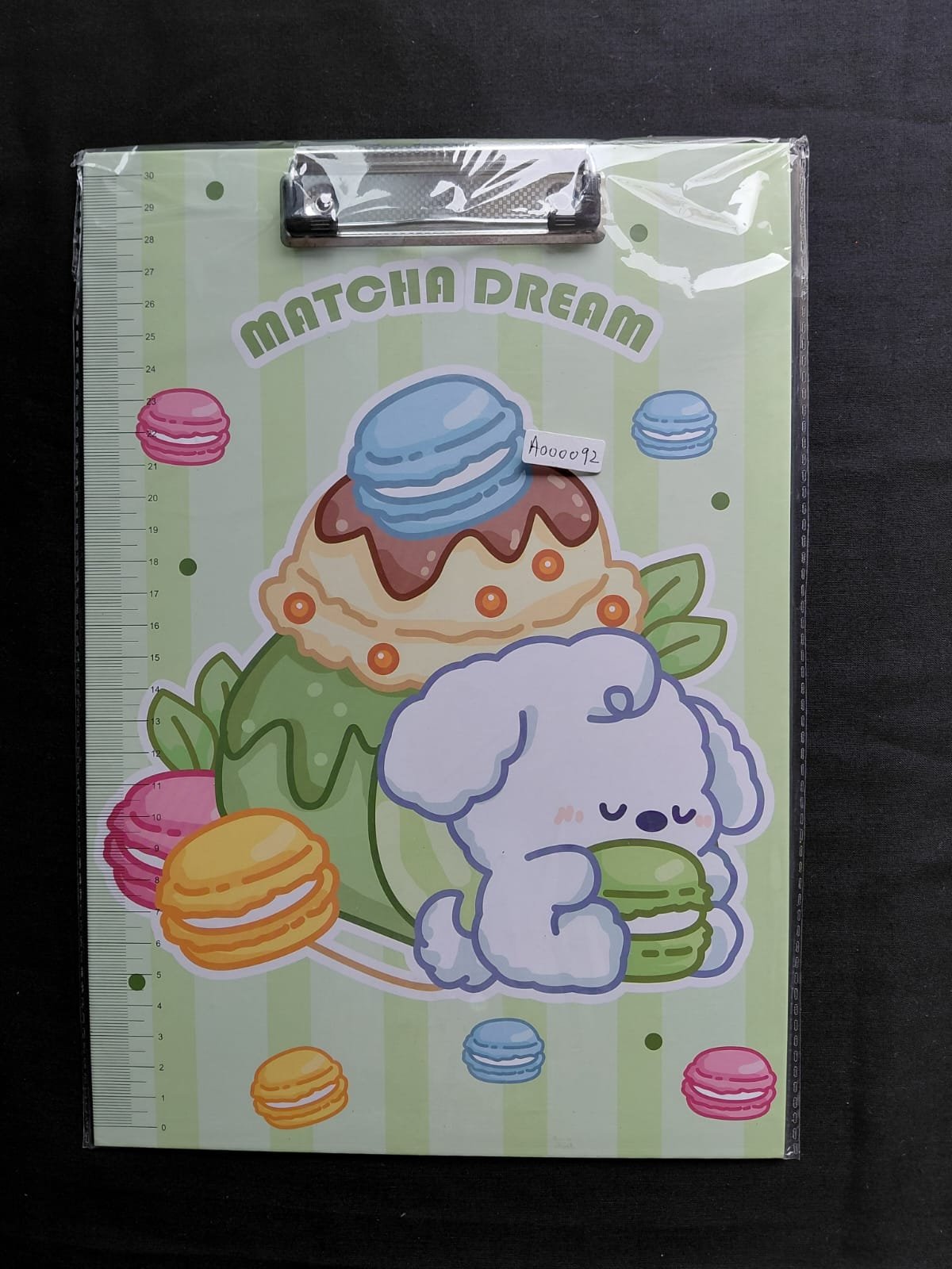 Bring a sprinkle of sweetness to your workspace with the Matcha Dream Clipboard! This charming accessory showcases an irresistibly cute white puppy snuggling a vibrant green macaron, surrounded by a playful array of colorful macarons and a whimsical matcha ice cream design. Perfect for students, professionals, and anyone who loves cute desk essentials, this clipboard also features a sturdy build and smooth writing surface. Available in a delightful mint green finish and standard A4 size, it?s the perfect blend of style and functionality for organizing your documents in style.